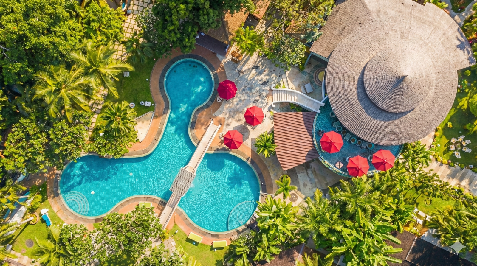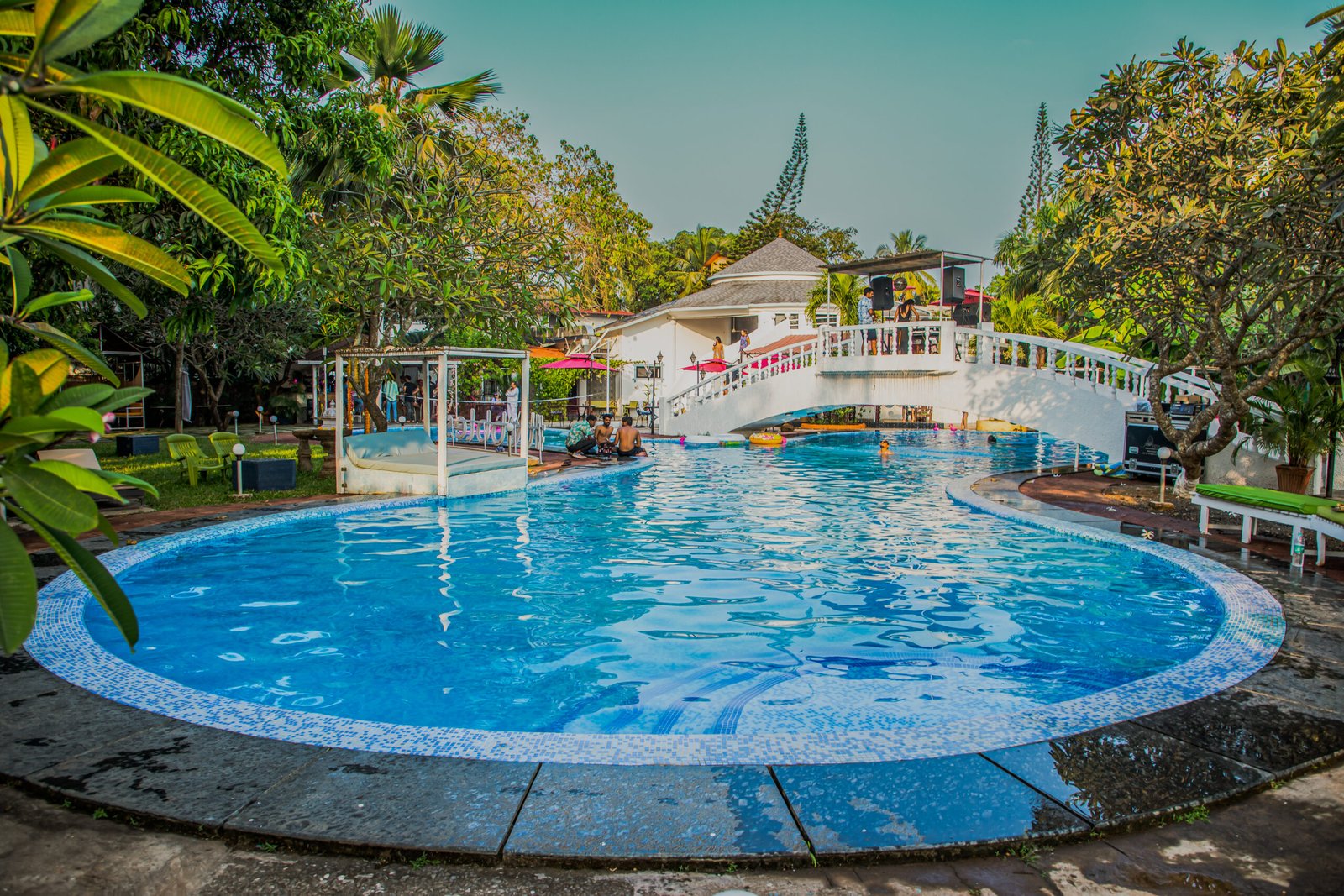 One of North Goa’s largest resort pool, surrounded by palms.